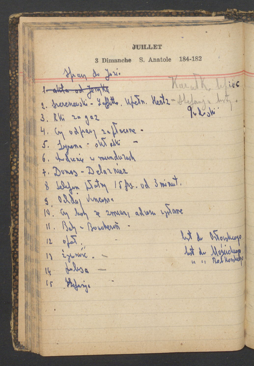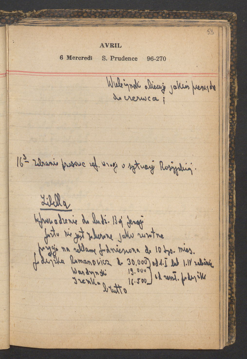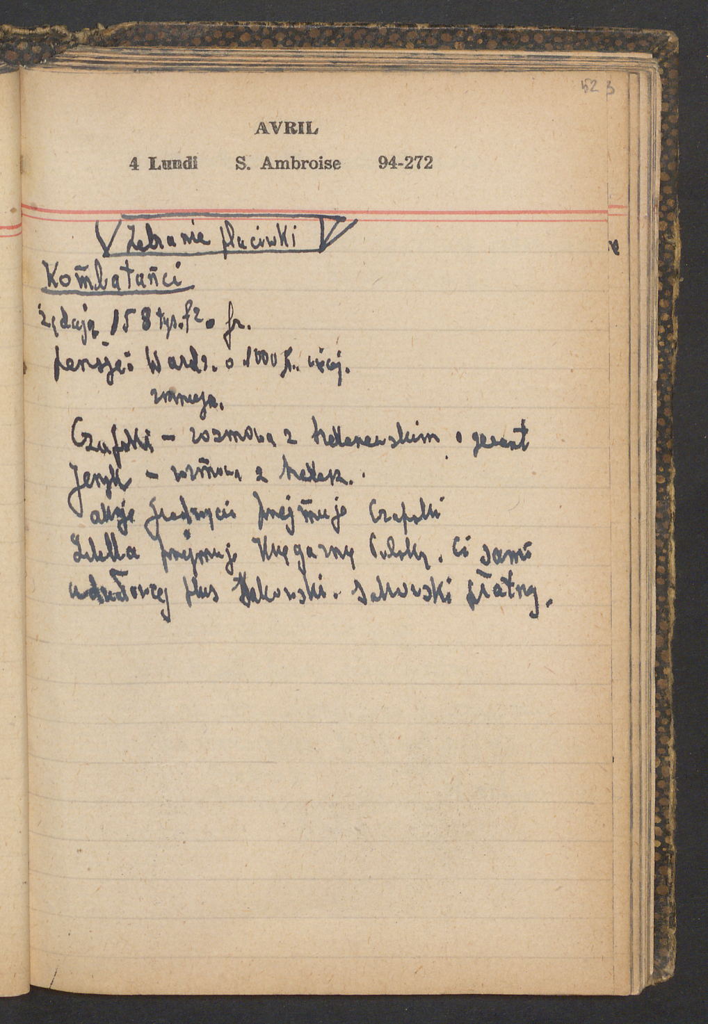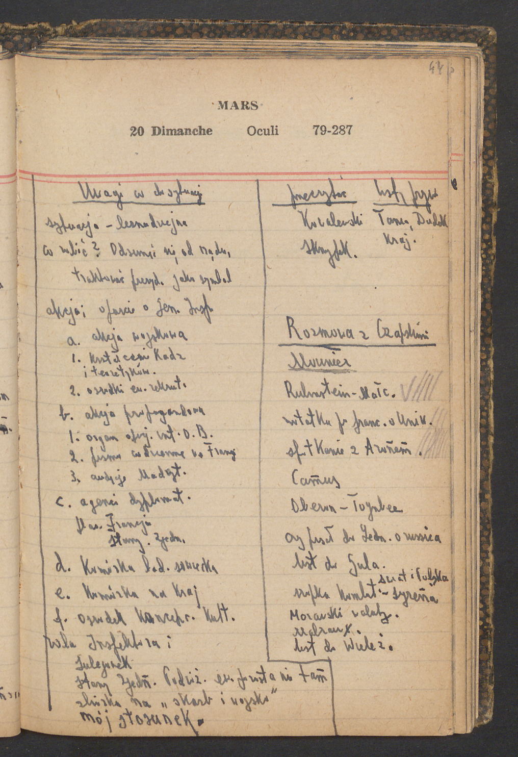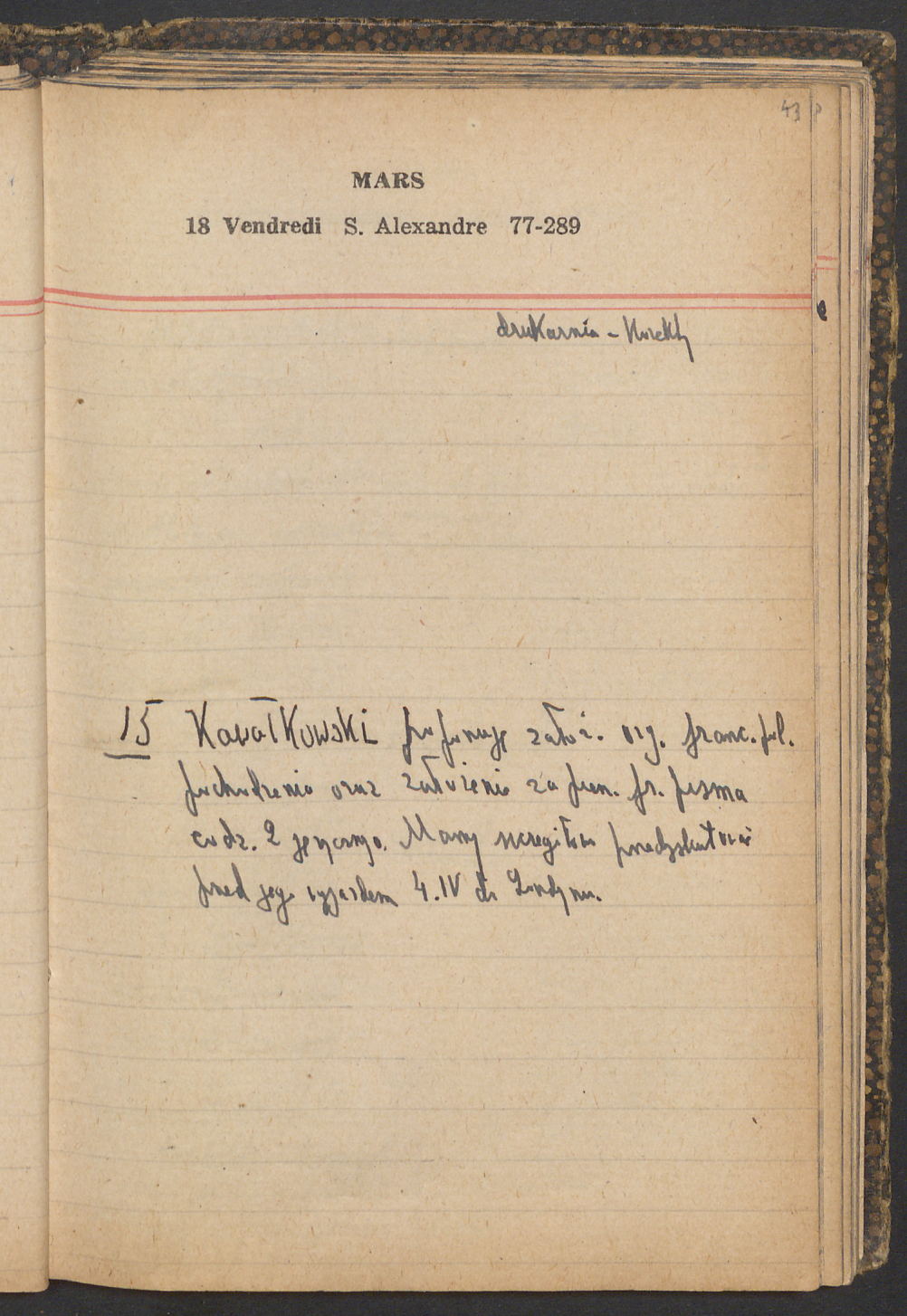 15 – Kawałkowski proponuję założ. org. franc. pol. pochodzenia oraz założenie za pien. fr. pisma codz. 2 języcznego. Mamy szczegółowo przedyskutować przed jego wyjazdem 4 IV do Londynu.