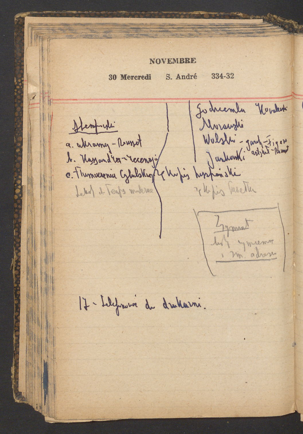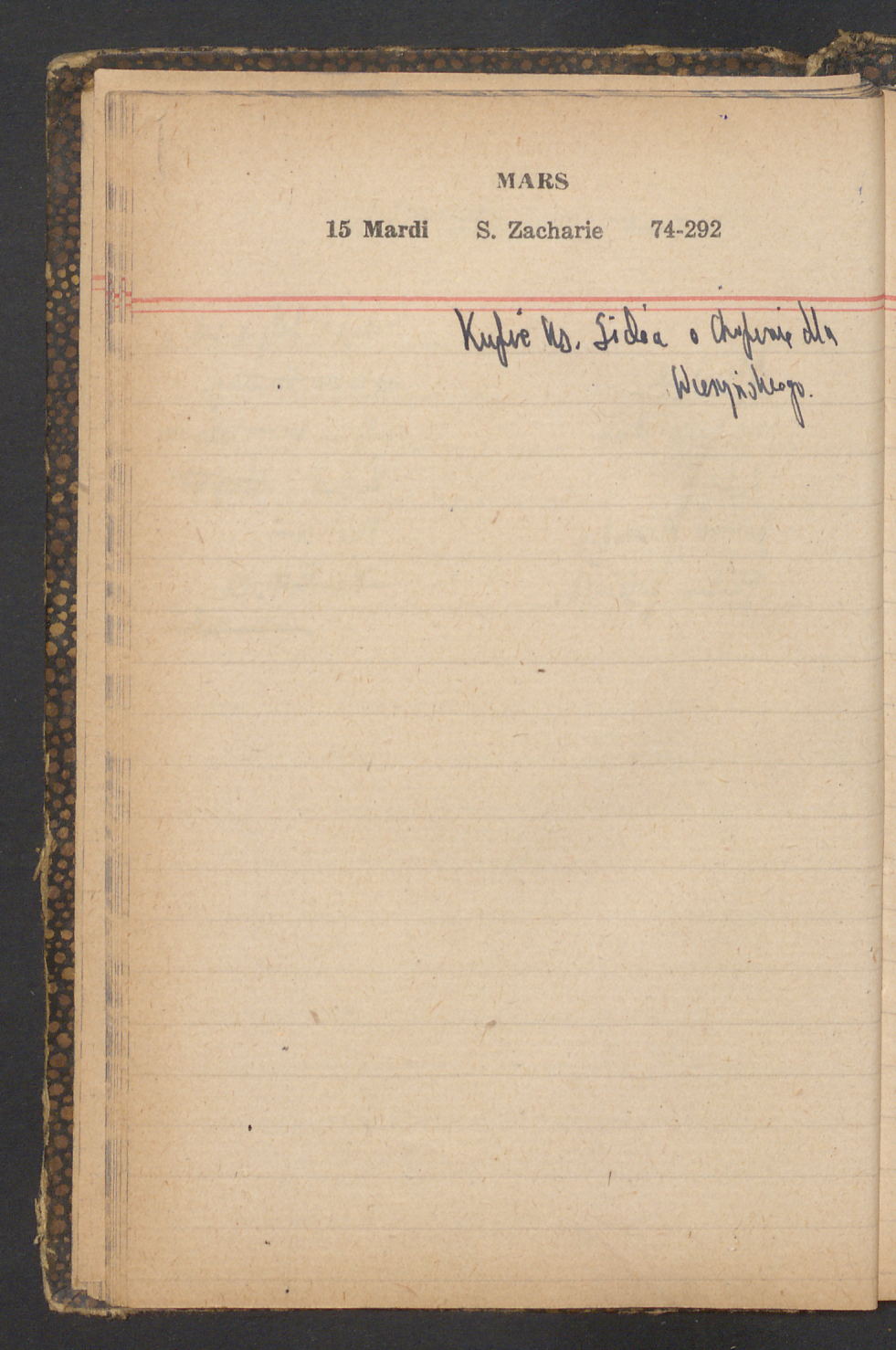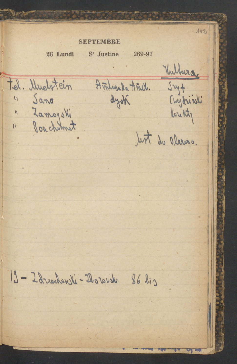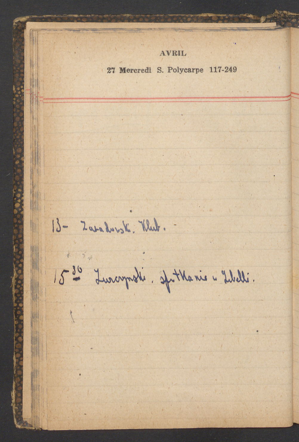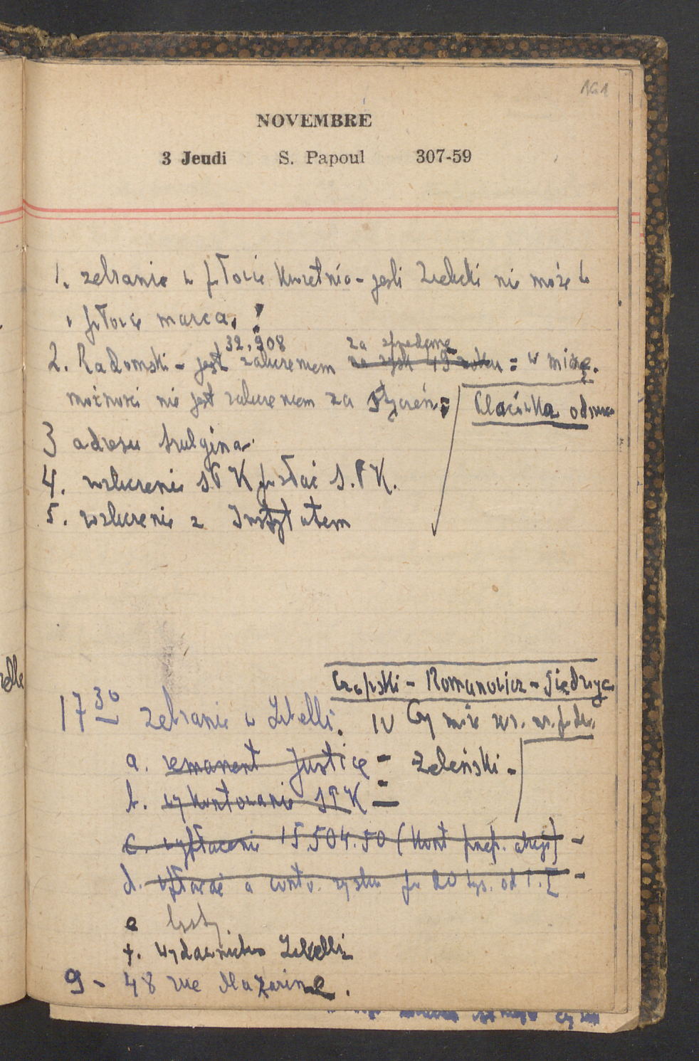 15 – Kawałkowski proponuję założ. org. franc. pol. pochodzenia oraz założenie za pien. fr. pisma codz. 2 języcznego. Mamy szczegółowo przedyskutować przed jego wyjazdem 4 IV do Londynu.