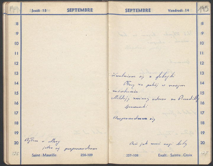 13 września Byłemu Mary jutro się przeprowadzam 14 października Zwalniam się z fabryki Płacę za pokój w nowym mieszkaniu Melduję zmianę adresu na Piccadilly Sprawunki Przeprowadzam się Boże, jak mnie nogi bolą Następna